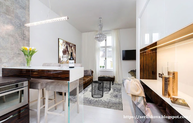 Разместить все в одной комнате, которая имеет лишь 33 м2, и сделать это со вкусом в соответствии с пожеланиями хозяина, по словам дизайнера было непросто. Там должен быть большой шкаф, большая супружеская кровать, и не откидная, бар с сиденьями для двух человек, в углу рабочий стол, большой диван и полностью оборудованная кухня с плитой и духовкой, вытяжкой, микроволновой печью и холодильник с морозильной камерой, а также посудомоечная машина. Все вошло, возможно, потому, что микроволновую печь выбрали с двумя функциями - с духовкой